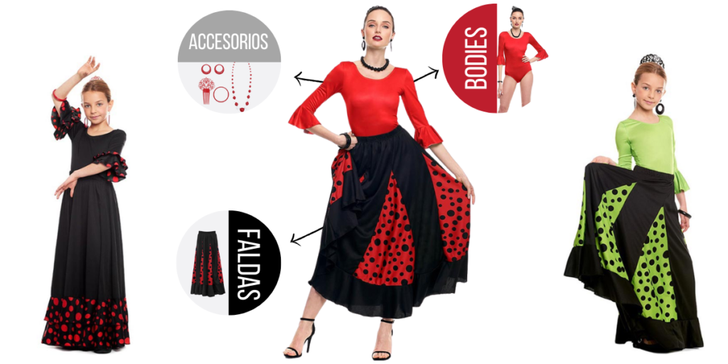 Puedes elegir los colores que más te gusten: negro, rojo, blanco, verde y sus combinaciones. Lisos, con lunares, con volantes… Y no te olvides de los pendientes, collares, peinetas, flores y mantones. Mira todos los accesorios para la Feria de Abril aquí.