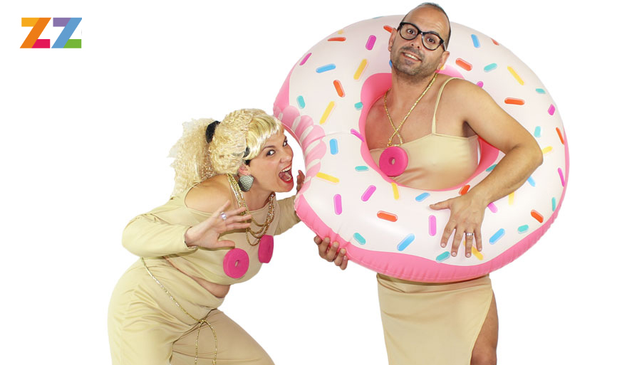 El cantante protagonista de ‘Cómeme el Donut’ que nos cautiva con ‘la cara partí-ah’. Este artista lleva un vestido de una sola pieza con un único donut en el centro del pecho y un colgante dorado. Termina el look con unas gafas de pasta. El disfraz de Cómeme el donut para hombre está hecho para el verano. El desparpajo de esta pareja hará las delicias de una despedida de soltero/a de locura.