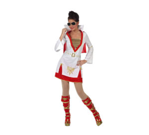 ¿Hemos dicho que hay verbenas, grupos de música y bandas? Pues para no desentonar con la música y las fiestas de tu pueblo, te traemos este disfraz al estilo Elvis Presley. Disponible también para hombre. Con él llevarás el ritmo en las venas, listo para bailar un swing digno de los años 50.