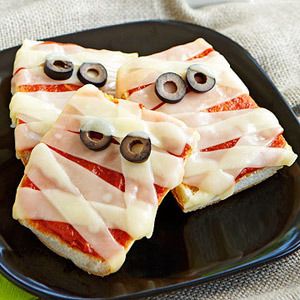 Si buscas algo para comer, sigue leyendo. Aunque el mantel ya venga decorado, nunca es poco cuando se trata de celebrar Halloween. Mira estas pizzas momificadas y riquísimas. ¿Qué te parecen? Una idea genial y súper fácil de hacer. Genial para niños y adultos, con un toque muy divertido. Solo tienes que cortar la masa de pizza en trozo rectangulares y colocar el queso en tiras como si fueran las vendas de una momia. Tiene buena pinta, ¿verdad? ¡Atrévete y saca al chef que llevas dentro!