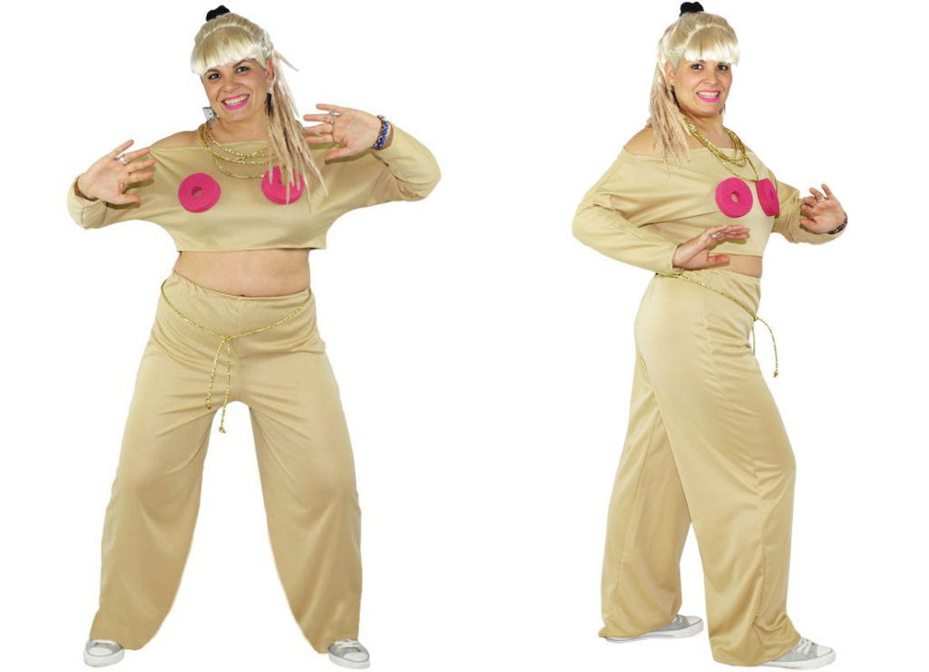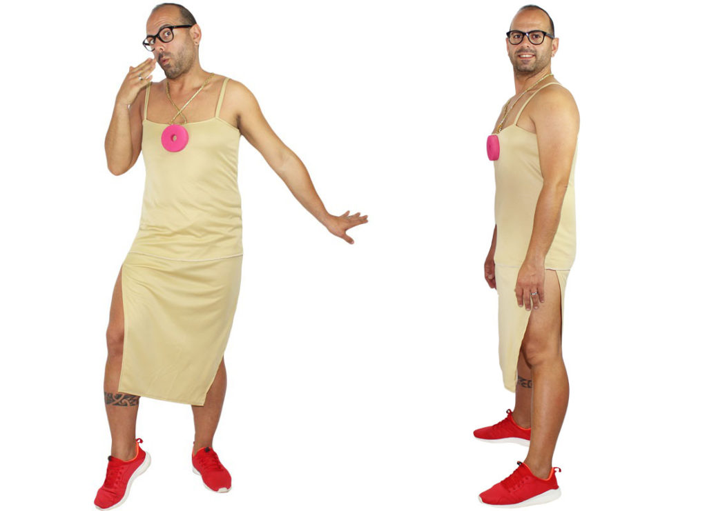 El cantante protagonista de ‘Cómeme el Donut’ que nos cautiva con ‘la cara partí-ah’. Este artista lleva un vestido de una sola pieza con un único donut en el centro del pecho y un colgante dorado. Termina el look con unas gafas de pasta. El disfraz de Cómeme el donut para hombre está hecho para el verano. El desparpajo de esta pareja hará las delicias de una despedida de soltero/a de locura.